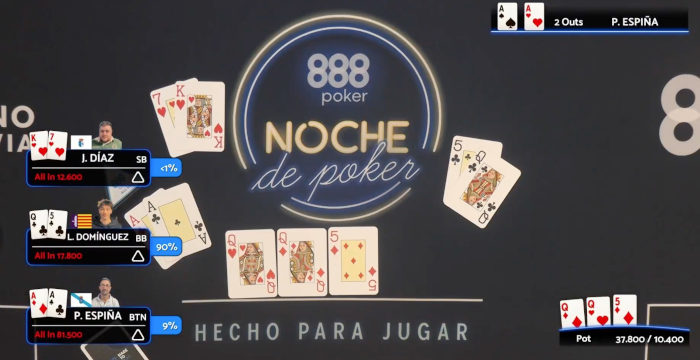 Con cinco jugadores en pie, el torneo vivió un momento de alto voltaje. Paco Espiña, de Pontevedra, recibió ases, la mano soñada en cualquier situación, pero más aún cuando dos rivales a los que cubría se restaban por delante. Parecía un spot ideal para eliminar a dos oponentes y asegurar bounties, pero el destino tenía otros planes y tras un flop con dos damas que completaban un full de damas cincos, el turn traería la última dama de la baraja, que cerraba un inédito poker de reinas o damas en Noche de Poker.